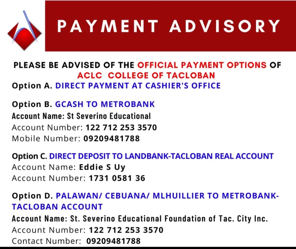 Address 352 Real St. Tacloban City, 6500 Contacts Email: admissionoffice_aclctacloban@yahoo.com Cell#: 0915 767 7449